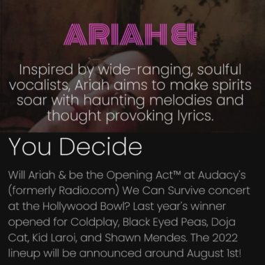 CLICK HERE after July 11th to VOTE FOR US to open Audacy’s We Will Survive concert at the Hollywood Bowl and win $10,000 that will go toward recording a full length album!